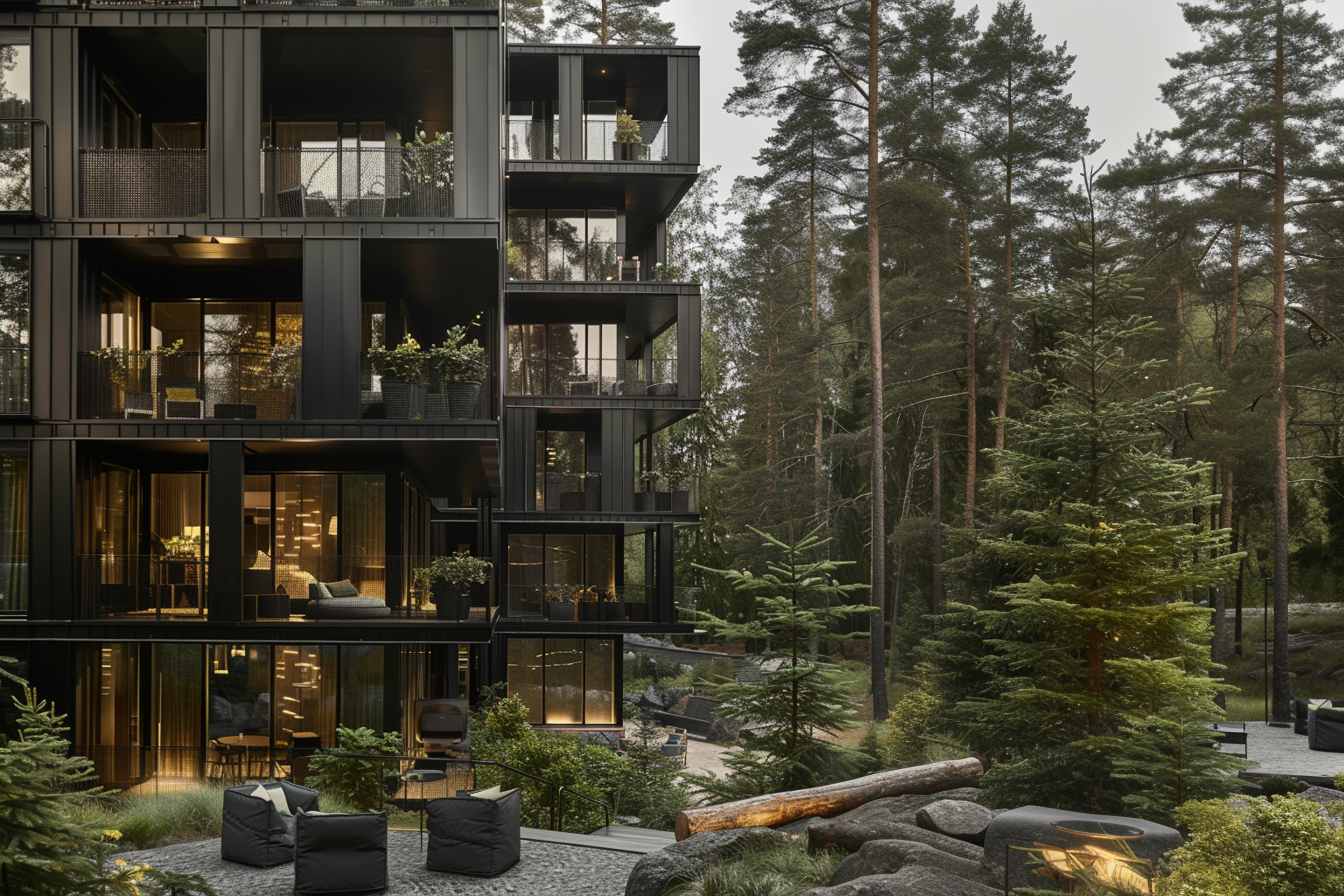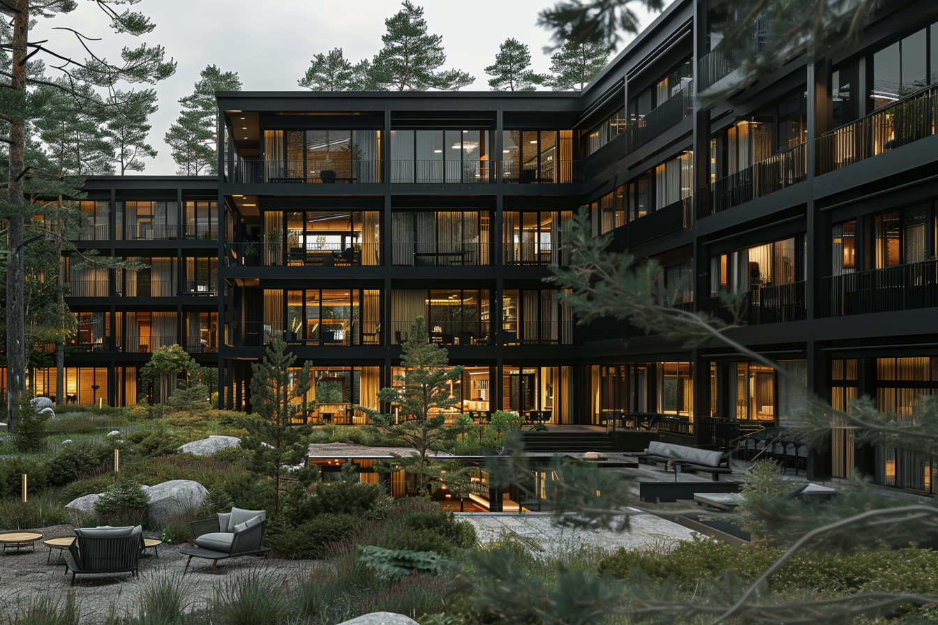 The black metal of the facades reflects the sun's rays, creating a play of highlights and shadows that makes the building a striking accent against the surrounding nature.